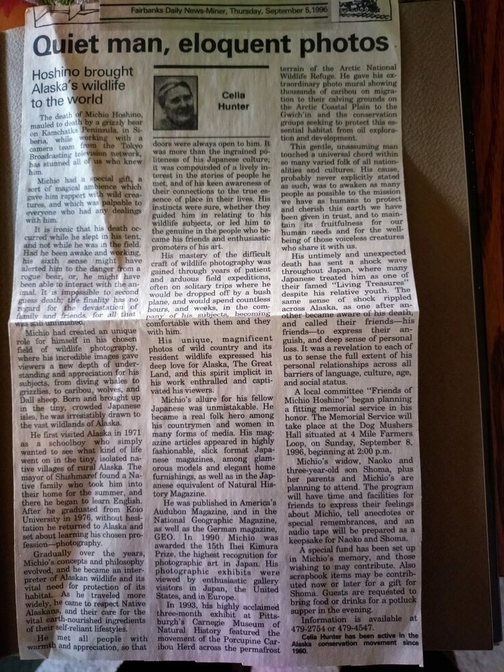 改めて、偉大な方を亡くしたことを残念に思う一方、私自身、彼の写真集やエッセイと大学生(19歳)のときに出会い、感銘を受け、これまで自分にできることを尽くしてきた結果、道夫さんとは生前にお会いすることはできませんでしたが、今回フェアバンクスでようやく彼と出会えた気がしました。