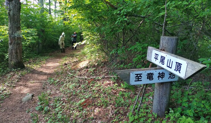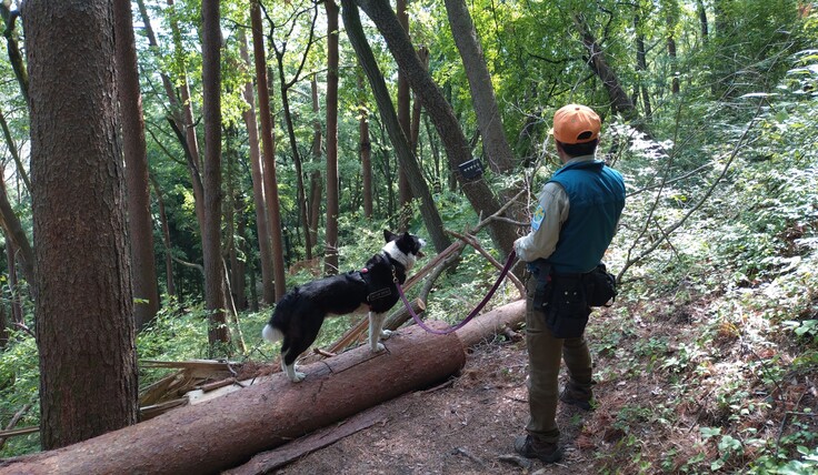 佐久市からの出動要請を受け、県や市の担当者と登山道の現地調査を行うタマと田中。