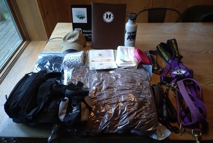 万が一のときのおむつやパンツ、タオルやペットシーツ、袋、水飲み、首輪やリードの予備、簡単なかじり物系のおやつ、玩具、動物検疫及びサービスドッグ認定の書類、水ボトルなどなど