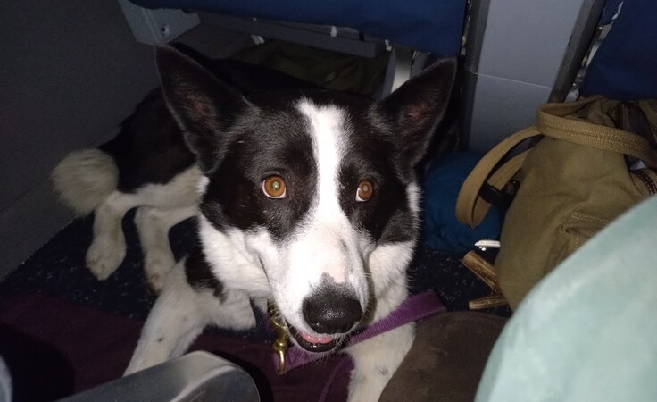 あまり与えると、羽田に着く前に便意を催し、もっとつらい思いをします。喉の癒やしも含めて氷が良いとキャリーさんから聞いていたので、CAさんに2時間おきくらいに3~4個届けてもらい与え続けました。また機内食でレラが食べられそうな物(フルーツや茹で野菜など)はすべてレラにあげました。持参した小粒のドライフードもちょいちょい与え続けました。