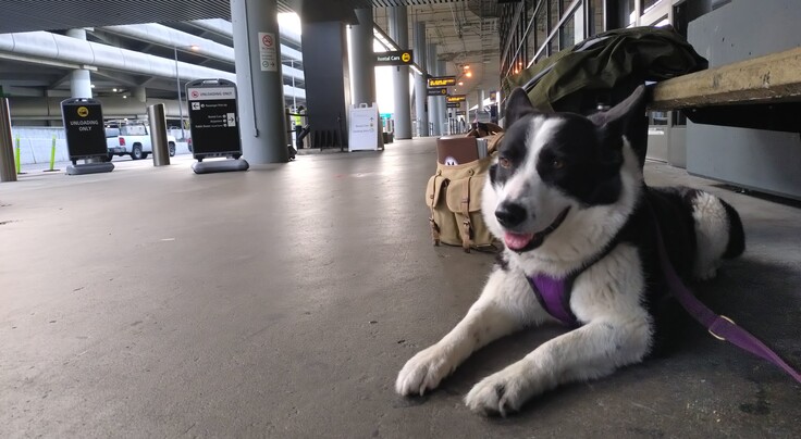 あまり早く空港内に入っても仕方がないので、しばらく空港前のバス停近くのベンチで休憩することにしました。やはりレラはめちゃくちゃ落ち着いてます。