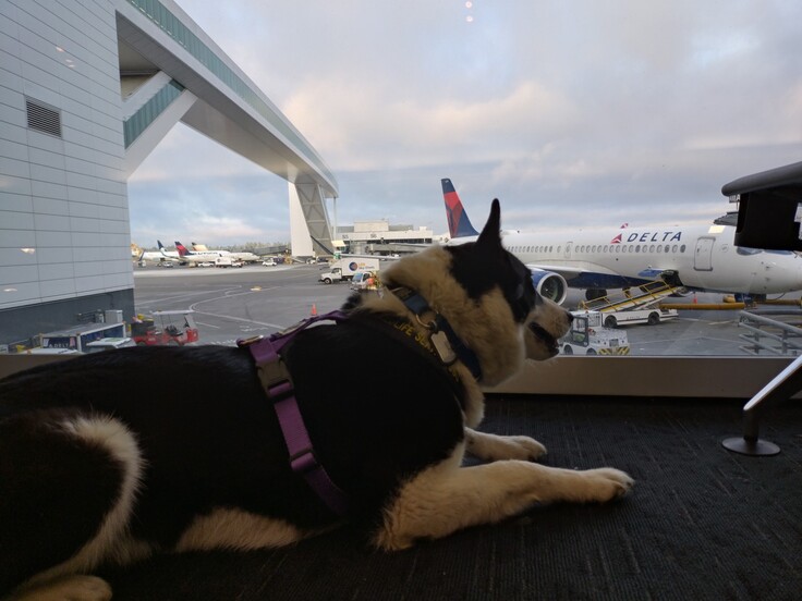 そして、いよいよフライトの時間が近づいてきたため、再度、手荷物とレラの検査を受けて搭乗口を目ざします。前回、あまりの不安から吠えてしまったシアトルのこの検査所も、やはり余裕の振る舞いでした。