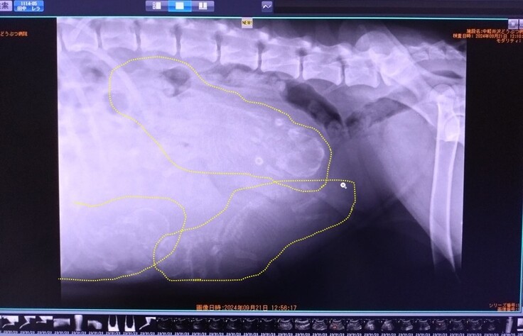 検査の結果、レラの子犬は 3頭(黄色い破線部が胎児) 。