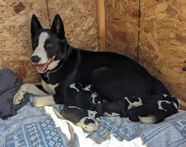 (写真)スカイと6頭の子犬たち