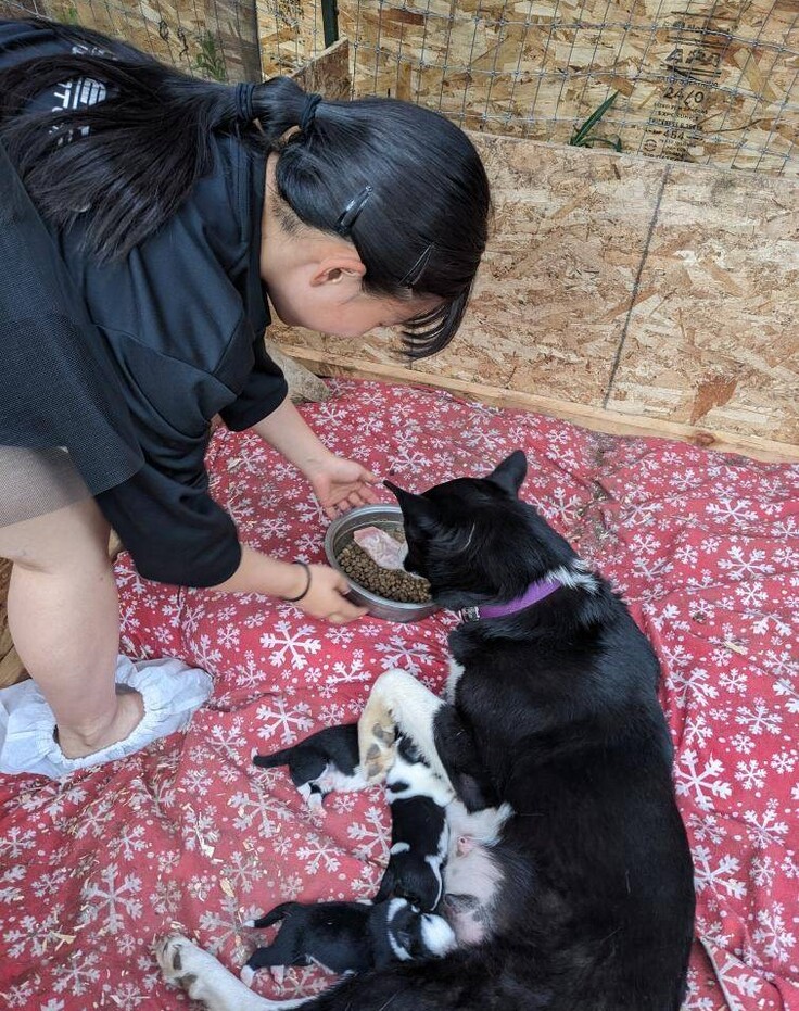 (写真)スカイと子犬たちの世話をする娘