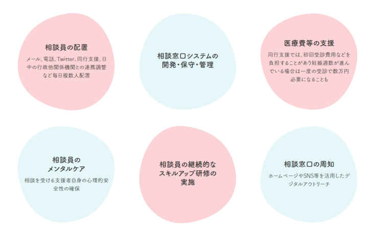 しかし、妊娠葛藤相談窓口を運営するためには、相談員の配置や相談窓口システムの管理、医療費等の支援など、以下のような様々な資金が必要となります。