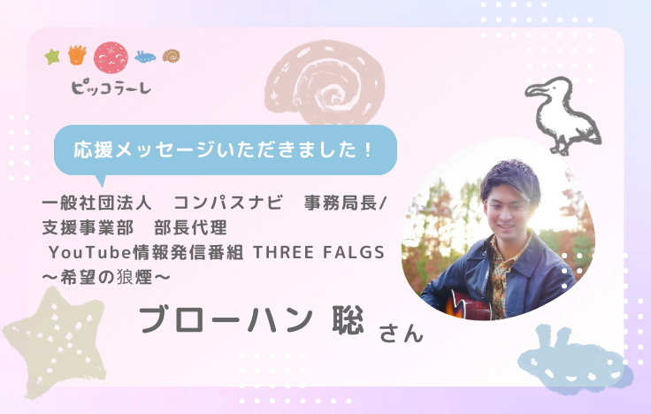 そのプロジェクトページにも掲載していますが、一般社団法人コンパスナビ事務局長/支援事業部部長代理、YouTube情報発信番組 THREE FALGS~希望の狼煙~のブローハン聡さんからの応援メッセージを改めて紹介します!