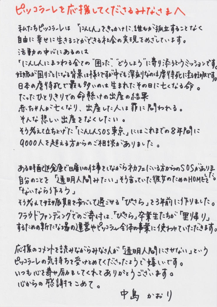 ピッコラーレ代表中島からみなさまへ、改めてメッセージをお届けします。