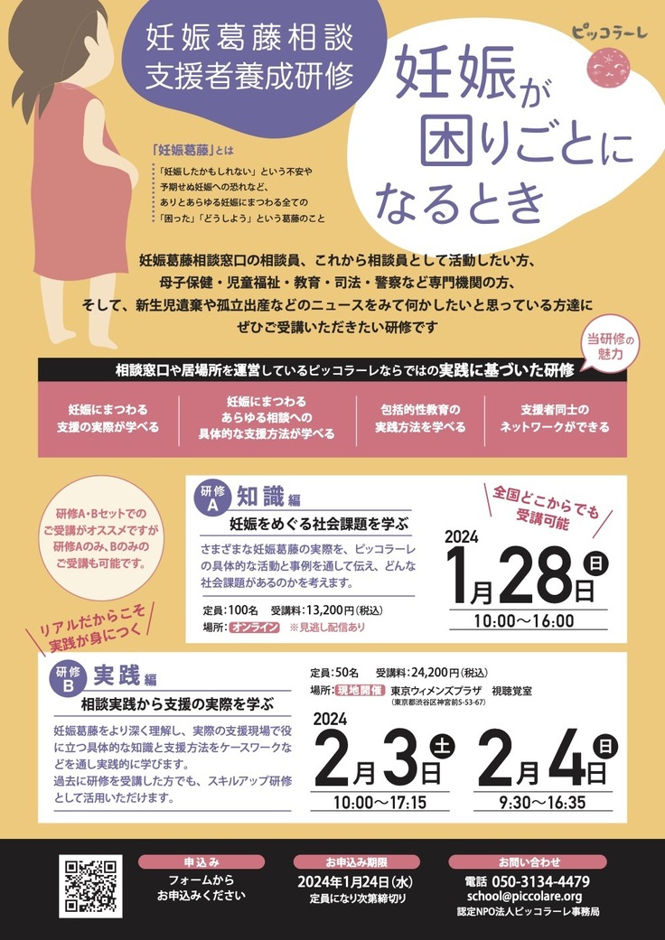 年明け1月・2月には、2023年度第2回「妊娠葛藤相談支援者養成研修ー妊娠が困りごとになるときー」を開催します!