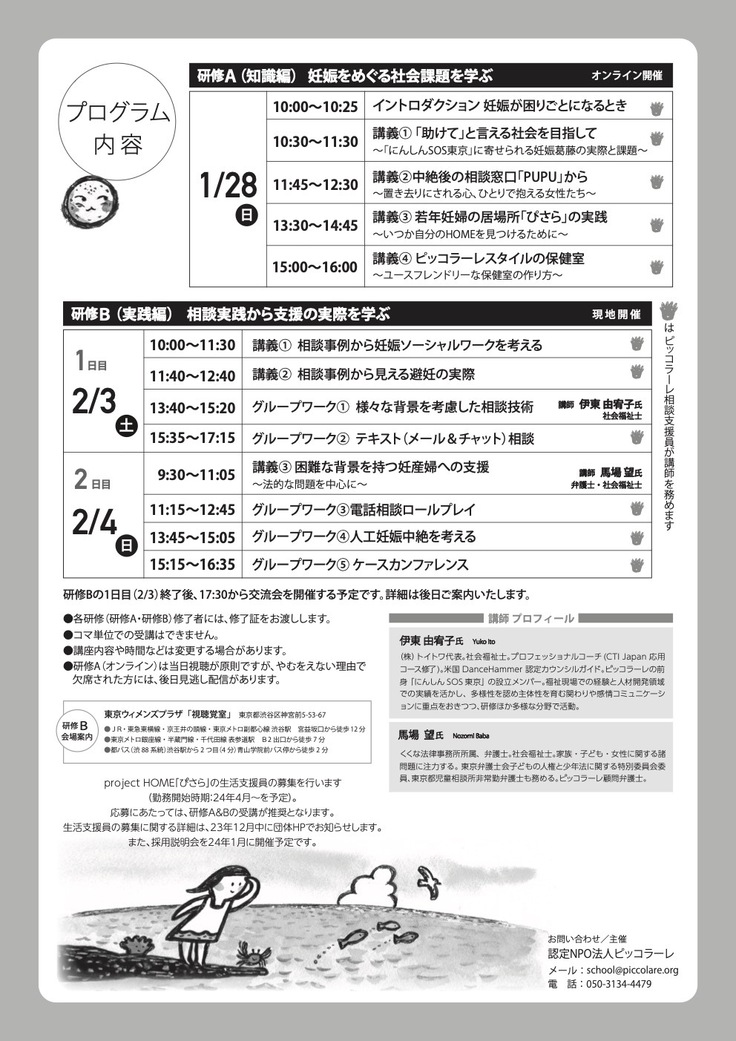 対象:妊娠葛藤相談窓口の相談員、これから相談員として活動したい方、母子保健・児童福祉・教育・司法・警察などの専門機関の方、その他若者支援の分野で活動されている方など、現場で役立つ実践的な学びの機会を得たい方向けの講座です。