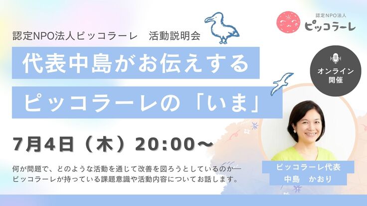 ピッコラーレは、毎月活動説明会を開催していますが、7月は代表中島が登壇して、最新のピッコラーレの情報をお伝えします!