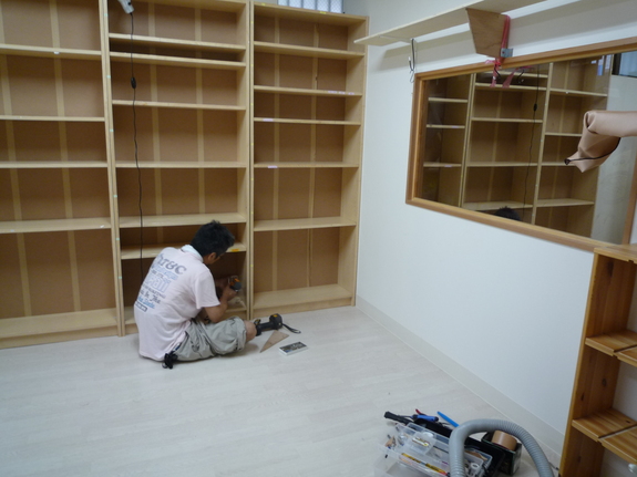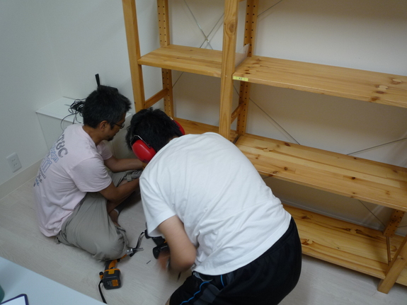 (新たな空間、スペースに収納棚の取り付けるWさんとTさん!