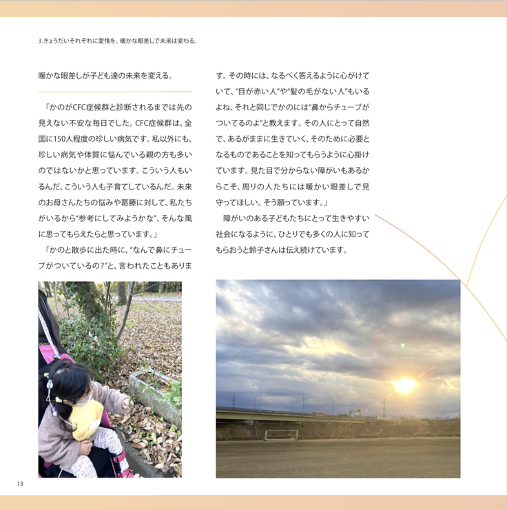 障がい児者と共に歩む“きょうだい”2名と“家族”2名の4名にインタビューし、障がいを持つ方のきょうだい関係や過去・現在・未来についてストーリーが掲載されています。