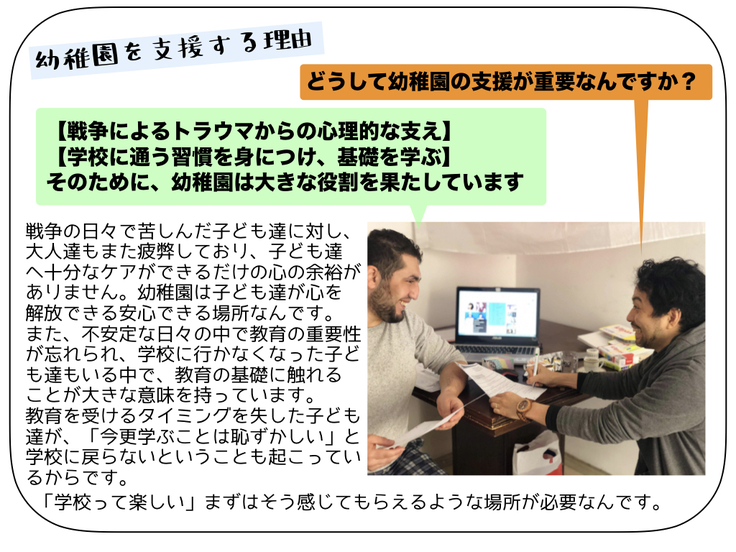 代表のウサマさんはシリアでは英語教師、現在は難民としてトルコに住んでいます。自身の生活が不安定ながらも、「子ども達は未来だ。銃ではなく教育という武器でシリアを変えていきたい」と、継続的にシリア国内の学校をサポートしていることに感銘し、2015年から共に歩んでいます。
