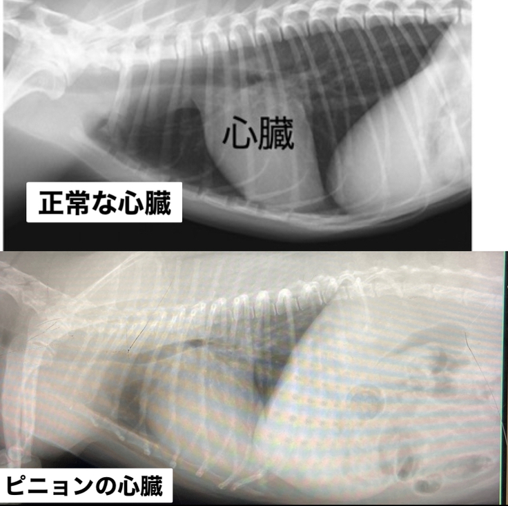 正常な心臓と比べるとピニョンの心臓は肥大してしまっています。