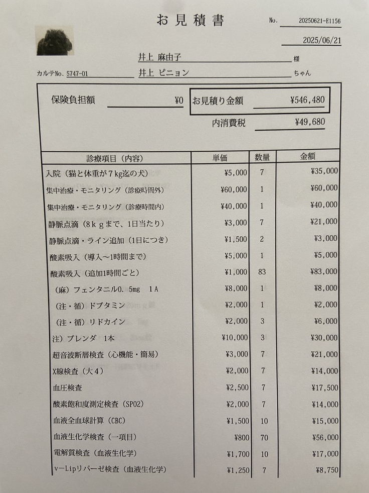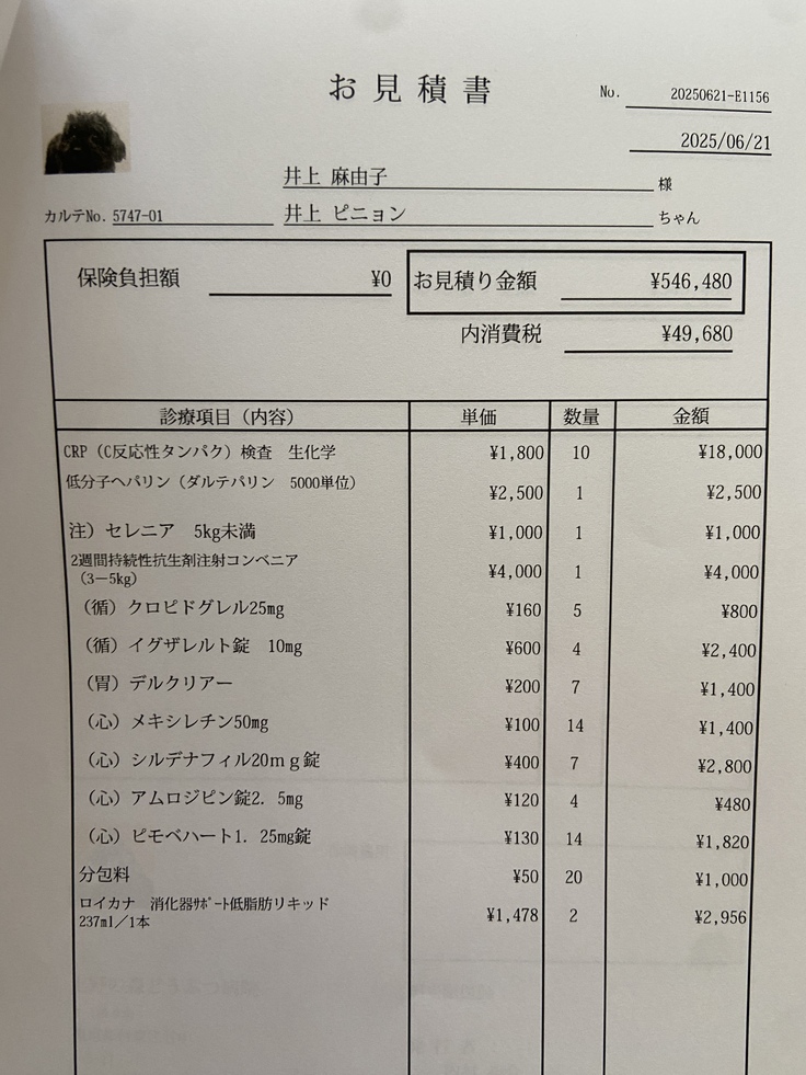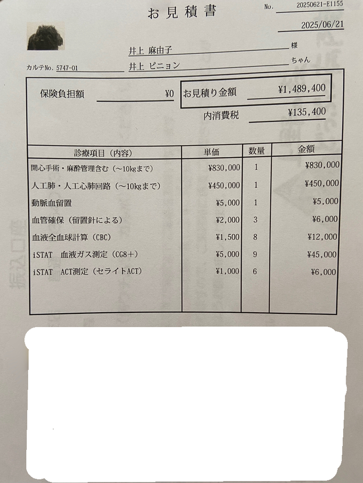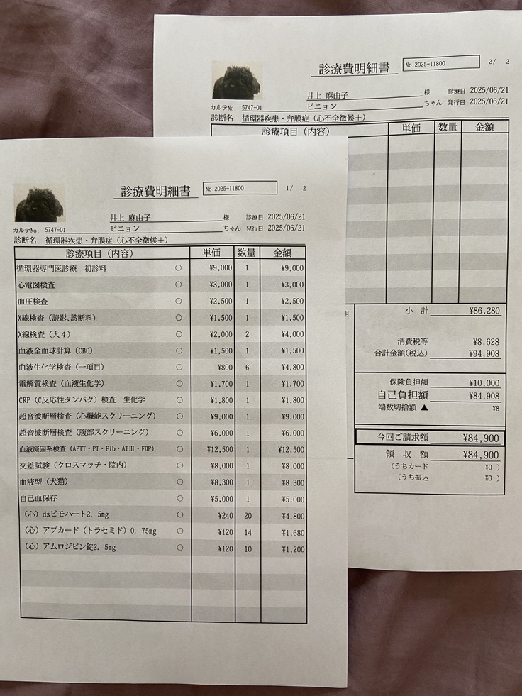 ピニョンの僧帽弁閉鎖不全症のこれまでと今後の治療費(手術費用/入院費、術前、術後検査費)に充てます