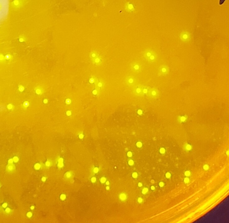 私の研究は、人工タンパク質で環境にやさしい材料をつくることです。タンパク質と光って関係するのか?と思う人もいると思います。でも、光るタンパク質もあって、私はそれを使って実験をしています。(写真は大腸菌のかたまりなのですが、大腸菌内で蛍光タンパク質が作られているので光ってます!)