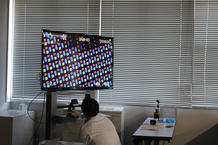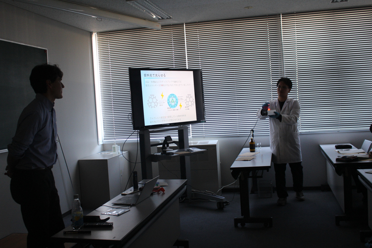 最後に有機ELディスプレイも拡大して液晶ディスプレイと比較するとともにアルブレヒト研究室で実際に開発している発光材料が光っている様子を見てもらいました。