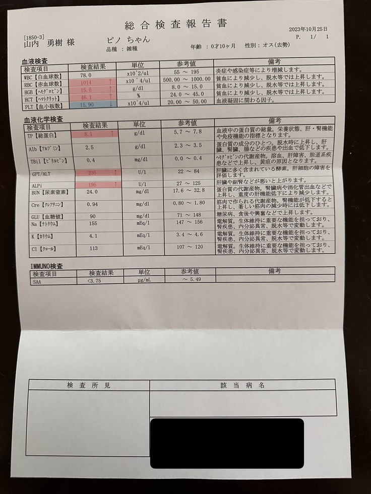 免疫に関わるグロブリンがまだ高いため総蛋白は高い値ですが、黄疸の指標となるビリルビンは正常値まで下がりました。
