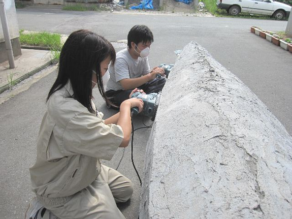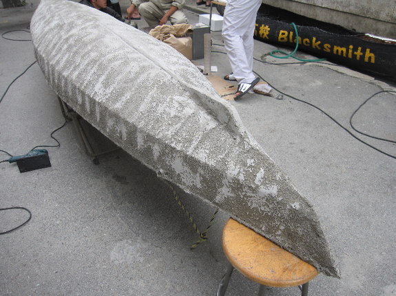 少しでも水の抵抗を減らすために、表面仕上げを丁寧に行いました。出ている箇所はサンダーで削り、凹んだ箇所には、再びモルタルを練り定着させます。このときは小手を使い、グッと力をいれて船体に押し付けます。この作業を繰り返し、表面を滑らかに仕上げました。
