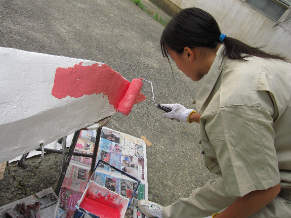 船体が薄肉構造のなったため、塗装をしっかり行うことで防水性を高めるように、はじめに浸透性のシーラーを塗りました。塗ると同時にモルタルに染み込み、シーラーが乾燥したら、発色をよくするために白ペンキ塗り、その上からピンクのペンキを塗りました。白・ピンク色ともに3回ずつ重ね塗りしました。