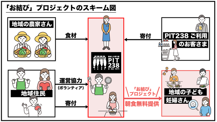 「お結び」プロジェクトは、地域の子どもたちと妊婦さんに月に2回程度、愛情を込めた温かいおにぎりと味噌汁等の朝食を無料提供するプロジェクトです。