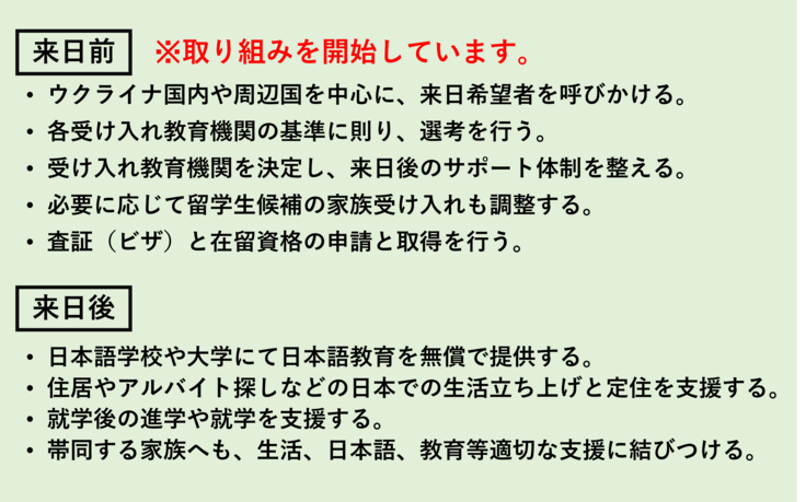 以下の流れで、ウクライナ避難者の留学生としての受け入れを進め、関係者と連携しながら、日本での生活立ち上げと定住を目指します。すでに、3月中旬ごろから、日本語学校や在日ウクライナコミュニティと連携し、来日希望者への呼びかけを開始しており、200人を超える方々から来日したいという声が届いています。ウクライナや周辺国の情勢、日本政府のビザ発行手続きの状況次第ではありますが、4月上旬の第一陣受け入れを目指し、現在活動しています。