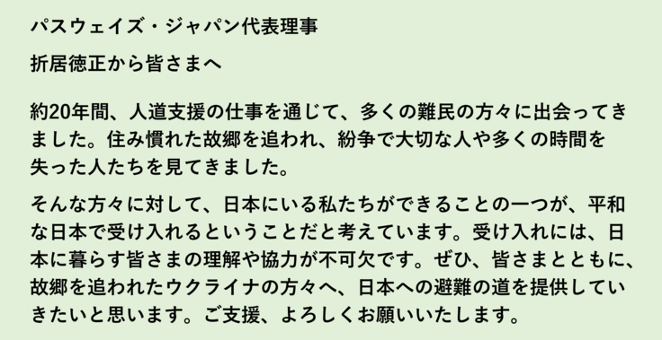 いただいたご支援は、ウクライナ避難者の日本への受け入れ活動に充てさせていただきます。