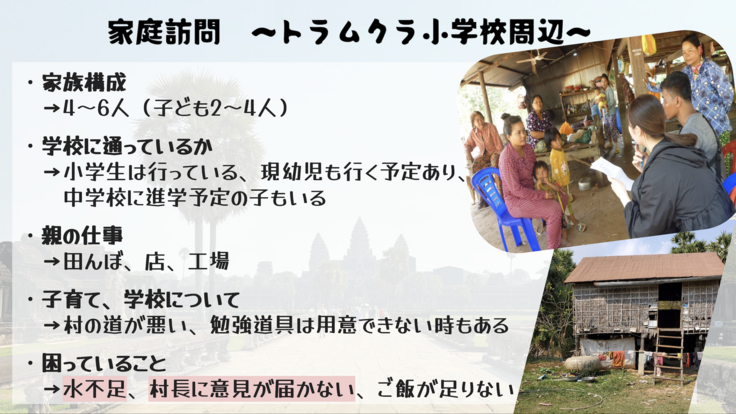 小学校周辺の家族を周り、生活環境や子供達の就学状況を調査。現地での生活の実態や、家庭ごとで様々な問題を抱えていることが判明しました。