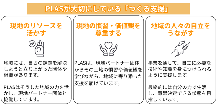 PLASのパートナーシップが終了しても、現地パートナー団体が自らの力で支援を届けられる状態を目指して、各団体の組織基盤強化にも取り組み、現地NGOが戦略的に活動を進め、成果を生み出せる環境を促進しています。