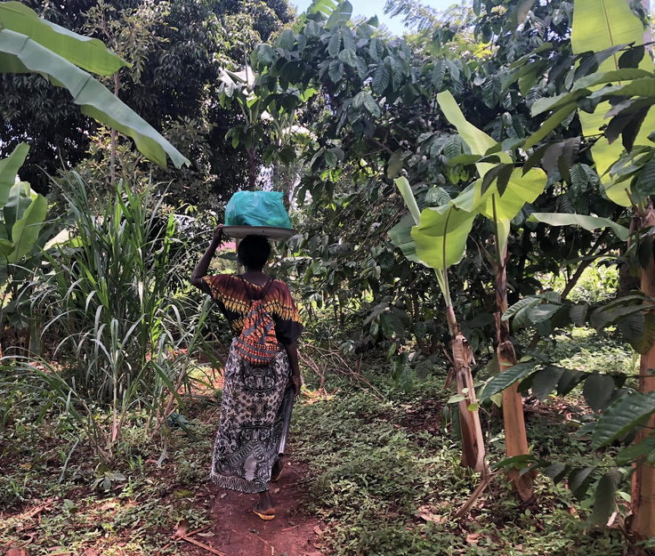 踊りながらけものみちを進みます。ちなみにジェシカの頭の上の薪は、15〜20キロくらいあります。そこらに生えているバナナの木の皮でさっと括って、運べるようにしています。