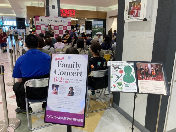 さて、過日6月2日(日)、PMF2024プレイベント第2弾としまして、イオンモール札幌平岡店にてミニコンサートを実施いたしました。お天気も良く、お散歩も兼ねて気軽にショッピングを楽しむご家族連れで賑わうモール内のスペースにて、ヴァイオリンとギターのデュオをお聴きいただきました。