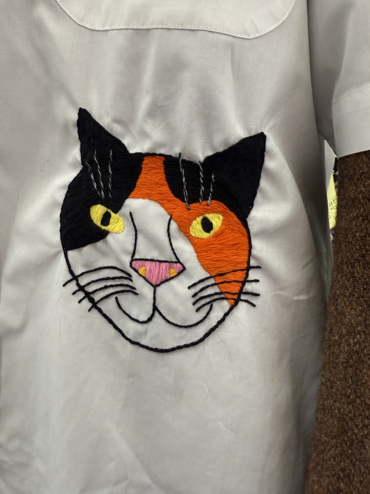 同じ白いシャツが2枚あったので、「1枚は猫にしよう、猫であればずっと刺繍したいと思っていた作家さんの猫だ!」
