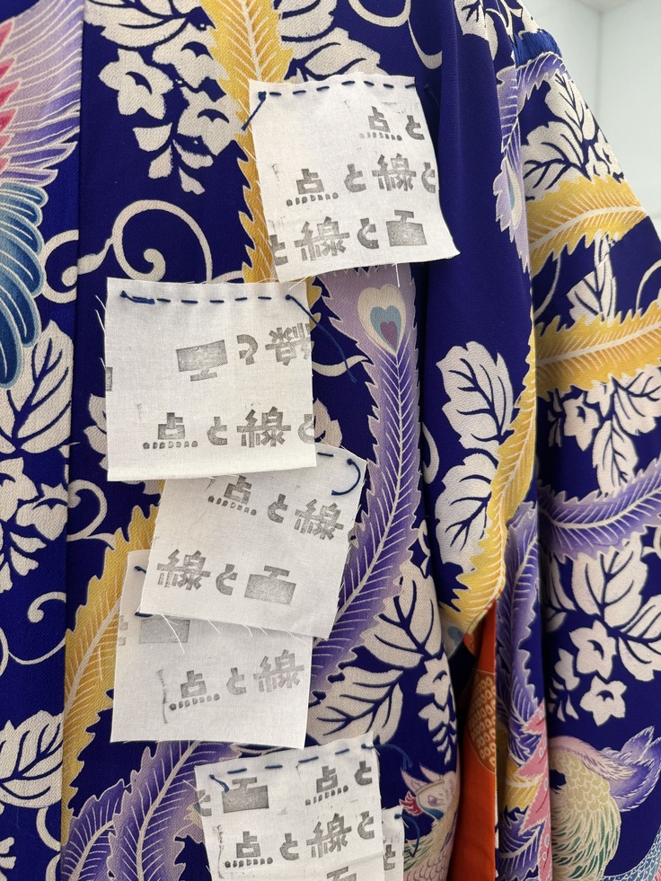 コレクションのテーマ【ストレス】が、点と線と面の刺し子と真逆であることに面白さを感じて、テーマを《コウフク》に変え、ポジティブワードしか書かれていない付箋を付けました。