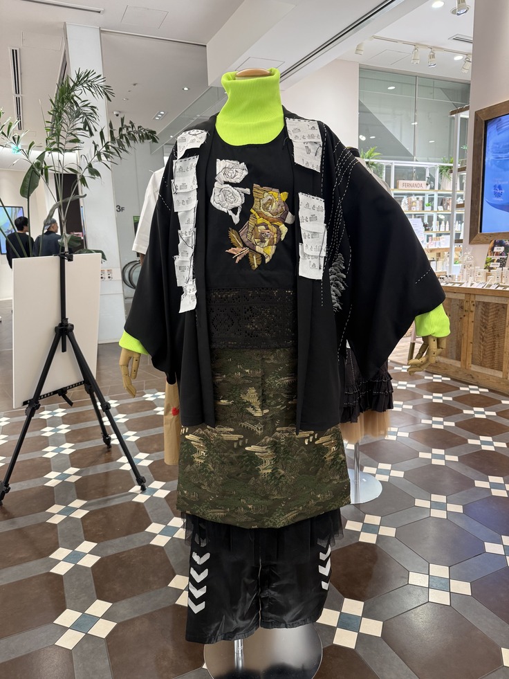 その黒いベストに、前面に刺繍がされた帯を合わせて前垂れの付いたトップスに。帯の高さに合わせるように、リターン商品を前掛けならぬ後ろ掛けにして、ロングジレのような袴のようなスタイリングにしました。