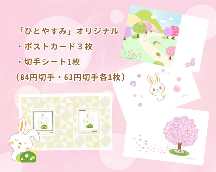 シールタイプのオリジナル切手シート(84円切手1枚・63円切手1枚)と可愛いイラストのポストカード3枚がセットになっております。