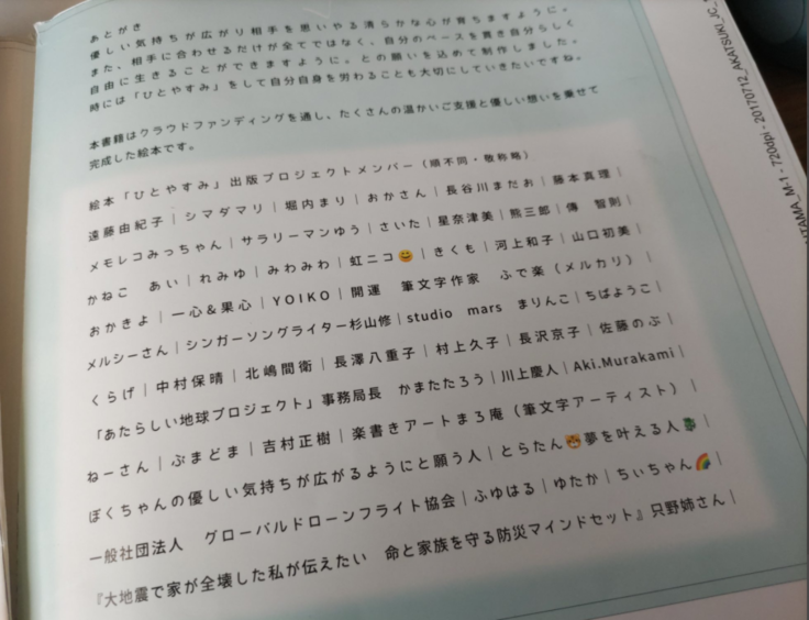 出版社と2回の校正作業を行い、最終確認も無事終了しました。ここから先は修正が一切できなくなるため、念入りにチェックいたしました。絵本原稿だけでなく、エンドクレジットへの支援者様のお名前掲載も完了しております。
