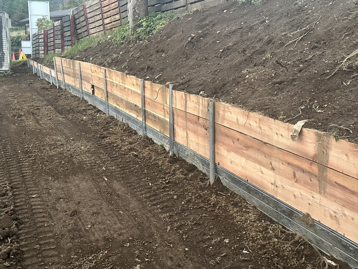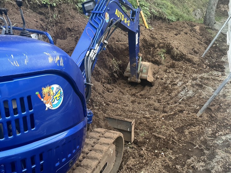 2ヶ月くらい前の大雨特別警報時に崩れた土砂を撤去し、馬が外に出てしまわないようにするための壁造りを行っています。