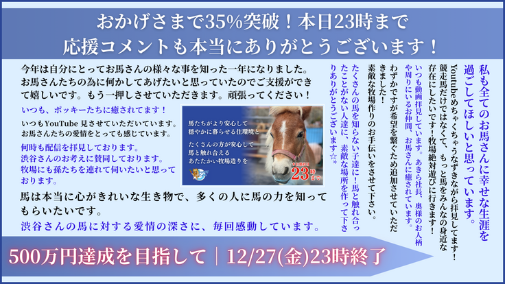 そして「殺処分の馬を救いたい」などの事実と異なる発信で馬のために支援してくださる方を騙すような形で誘導しなくても、馬のためのクラウドファンディングは成功できるんだ、賛同者が集まるんだということを示したいという強い想いもありますので、やっぱり成功させたいです。ここまできたら僕だけのプロジェクトではなく応援いただいている皆様とのプロジェクトでもあるので、達成したいです。
