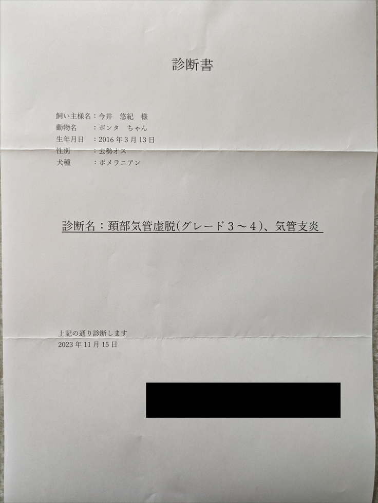 ポンタは気管虚脱グレードⅢ〜Ⅳと診断されています。気管虚脱は気管が潰れてしまう病気です。常に潰れたストローで呼吸しているような状態です。進行性で、末期では息が出来なくなり、気道閉塞を起こして命を落としてしまいます。