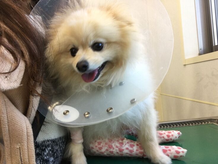 ▲膝蓋骨脱臼術後の面会時。うちに来た時から、膝蓋骨脱臼を患っていたポンタ。歩く度に悲痛な声をあげて座ることが増え、1歳10ヶ月のときに両膝の手術をしました。