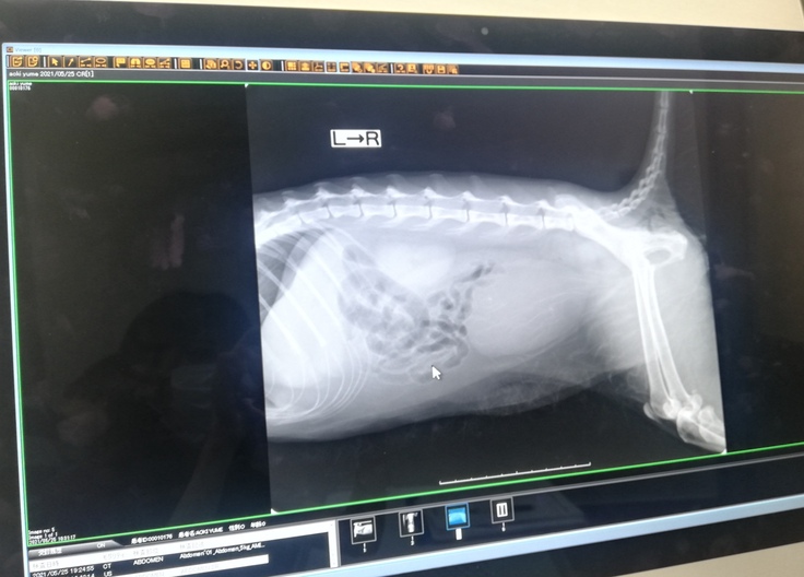 膀胱が大きく膨らんでしまっている様子のレントゲンです。