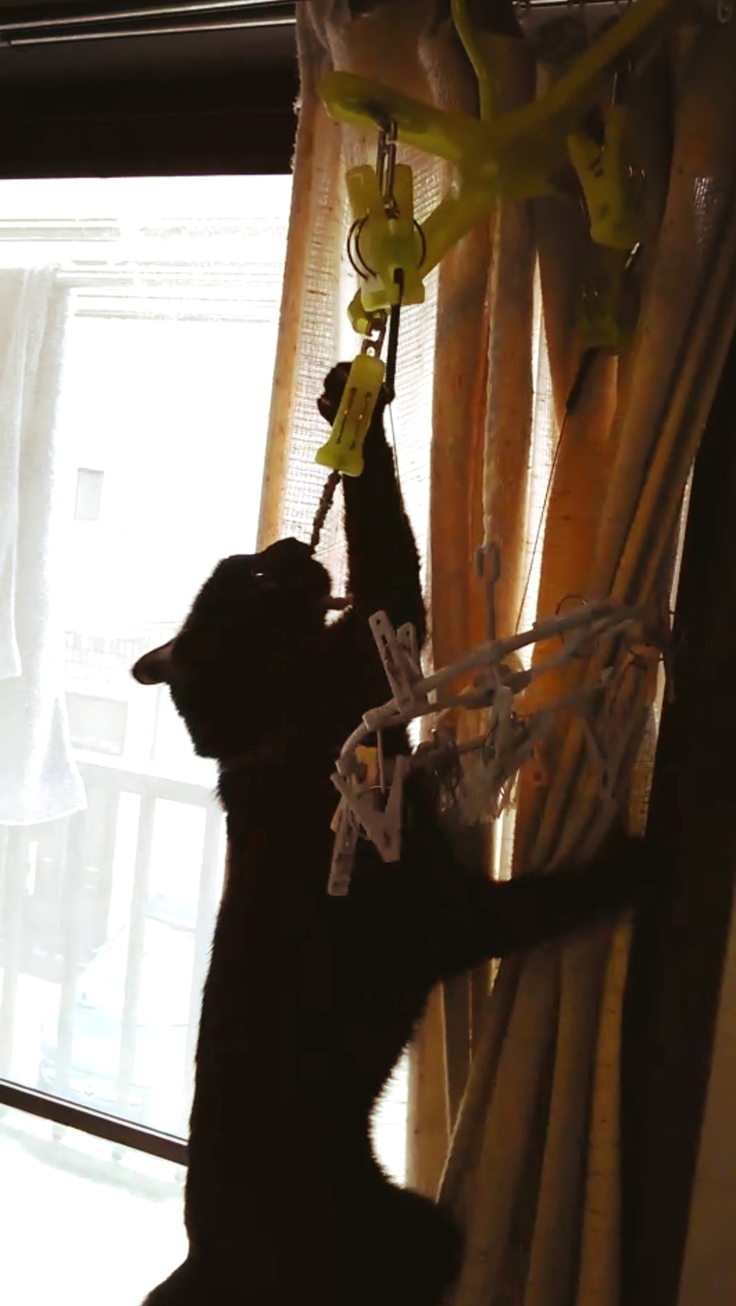 洗って干していたおもちゃに、待ちきれず飛び付くゆめ。