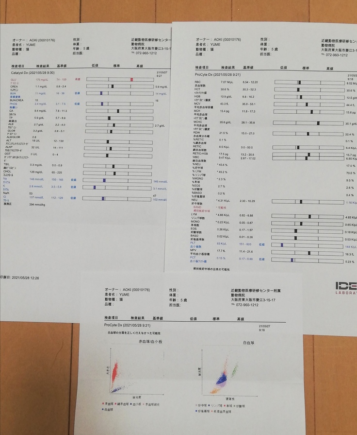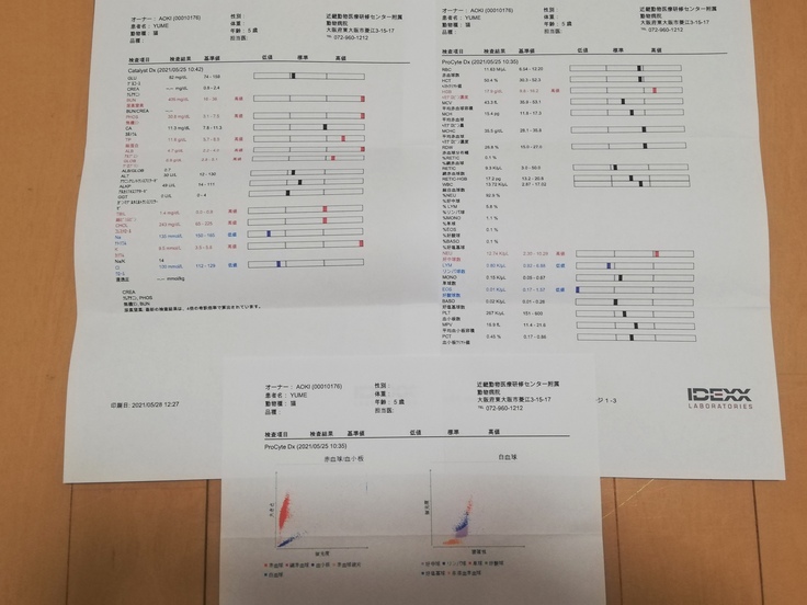 膀胱がぱんぱんに膨らむまで溜まっていたおしっこを抜いてもらい、少し楽になったのか、なんとか耐えてくれましたが、血液検査結果は非常に悪い数値でした。