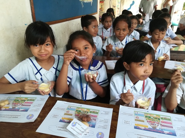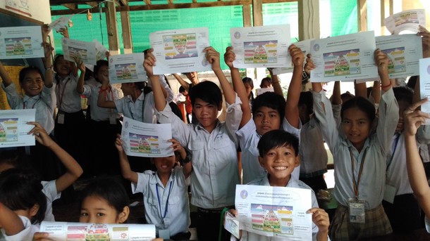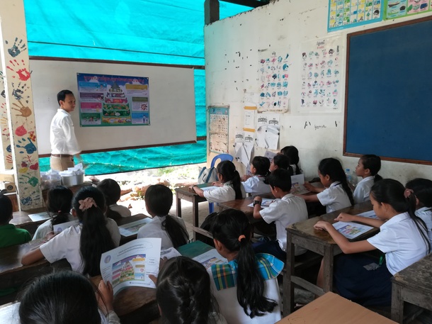 カンボジアでは、昨年、保健省から、カンボジアの学齢期の子どものための食品ピラミッドと健康な食生活のためのメッセージが公表されました。今回、私たちはこれを教材に、健康な食生活について子どもたちに説明しました。