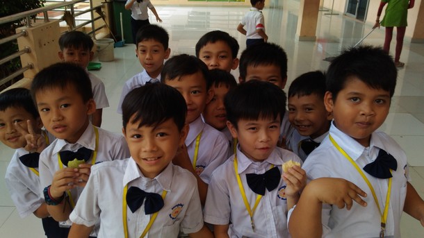 「10歳ぐらいの子どもたちに食べて欲しい」とお願いすると、「ちょっと待ってて、みんな呼んでくるから」と校長先生。