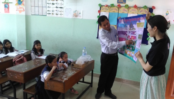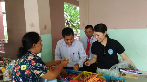 ついでに、学校内の売店も視察させてもらいました。ここで売られるお菓子の値段は、500リエル〜1500リエル。やはり値段競争が厳しいです。しかし、いつの間にか、校長先生も「自然な味付けで作ってるから、体にもいいよ。ほら、このサンプル食べてみて、美味しいよ」と、売店のおばさんに売り込み。