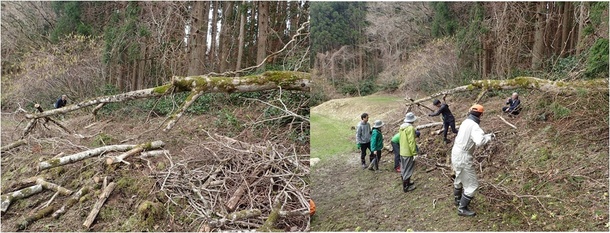 今回は、冬場に倒れたクルミの木を片付ける作業。重機など入れないので、ほとんどの作業が人力です。20人のマンパワーで見る見る内に綺麗になりました。玉切りした木材は、燃料に使います。