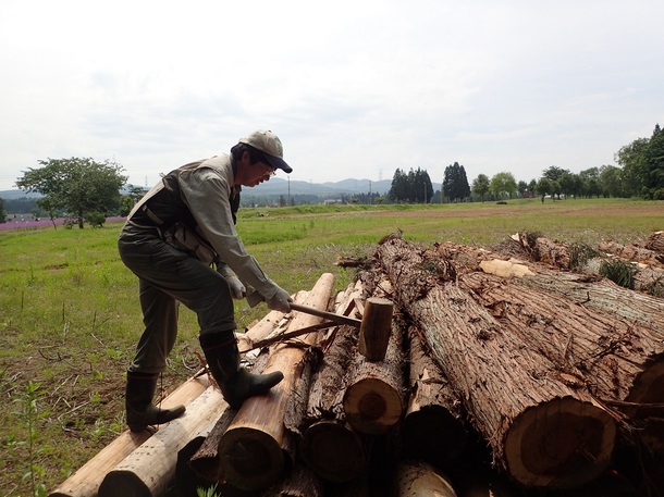 間伐したスギの木を木づちで叩いているのはわかるかと思います。