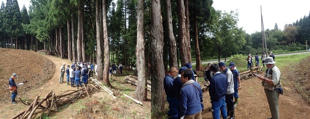 間伐したスギ林の中から、適当な枝を収集し、二ホンリスの気持ちになって森につなぐ二ホンリスの小径(隠れ場)を整備します。